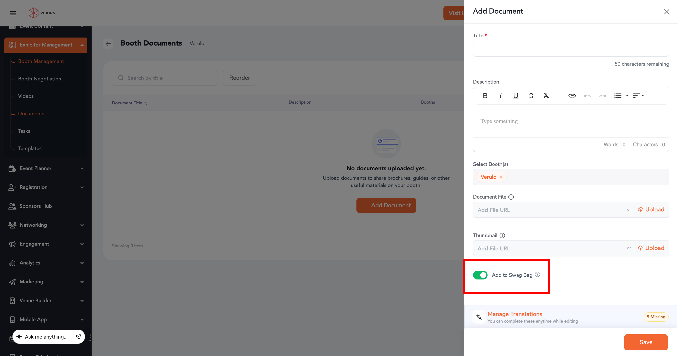 - Organizers can enable a Swag Bag Menu on the event frontend.