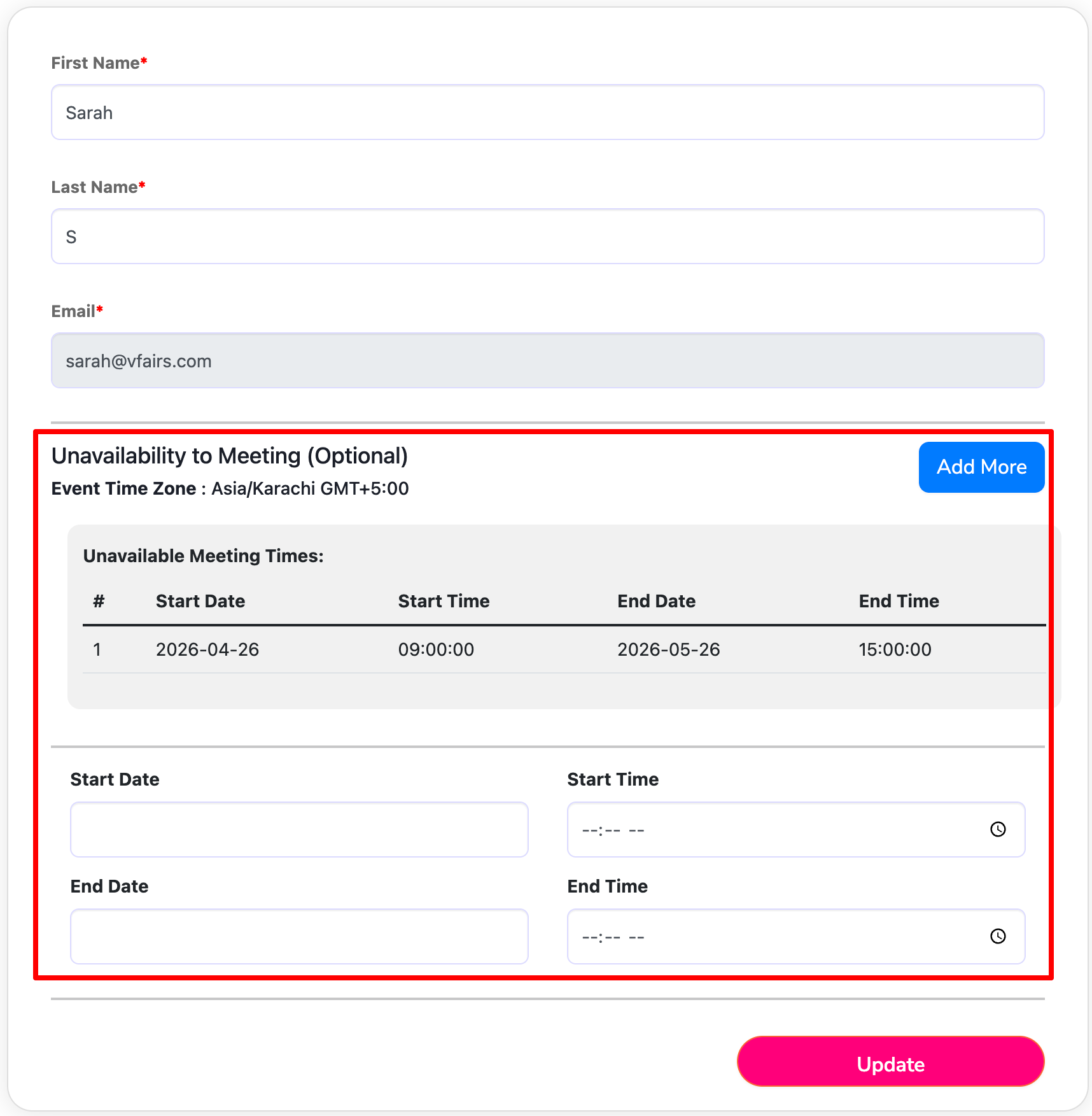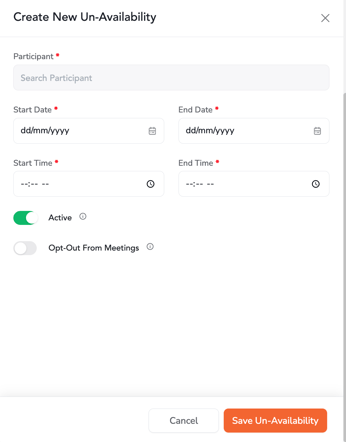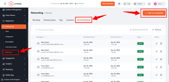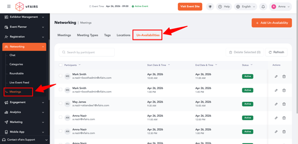 The Meeting Module allows organizers and participants to manage availability and unavailability (blocked time) for scheduling meetings. By default, all users are considered available for the entire event duration. If networking hours are configured, users are only considered available during those defined time slots. Users can mark specific time periods as unavailable to prevent meetings from being scheduled during those times.