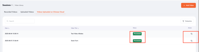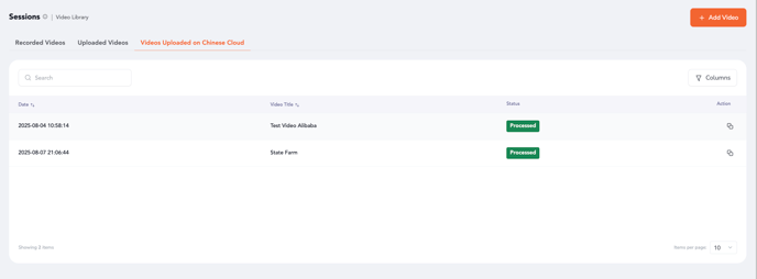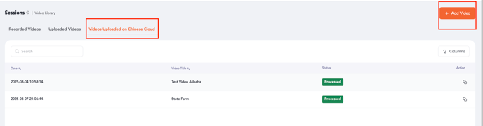 5. Once uploaded, the video will appear in the listing under the "Videos Uploaded on Chinese Cloud" tab.