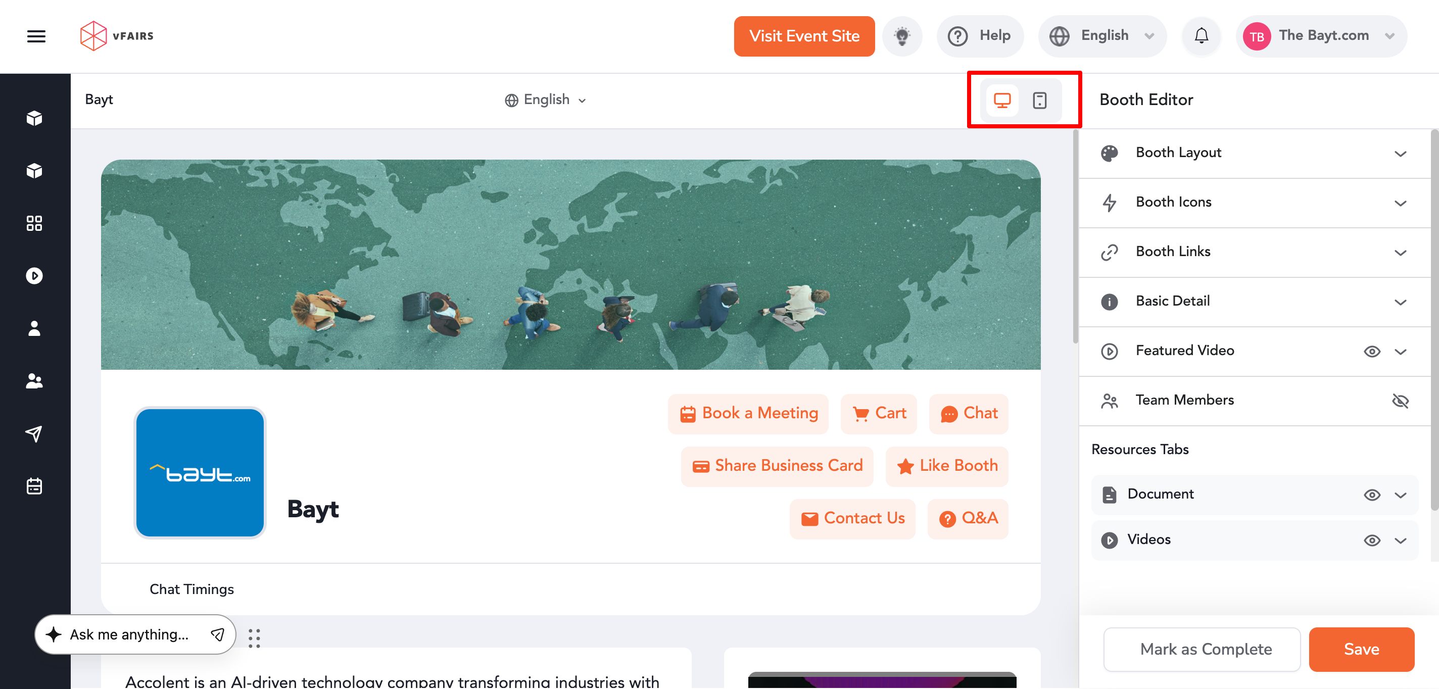 The Live Booth Preview feature helps exhibitors validate their booth setup in real time across both web and mobile experiences. By switching between views and reviewing updates instantly, you can ensure a polished and consistent booth experience for all attendees.