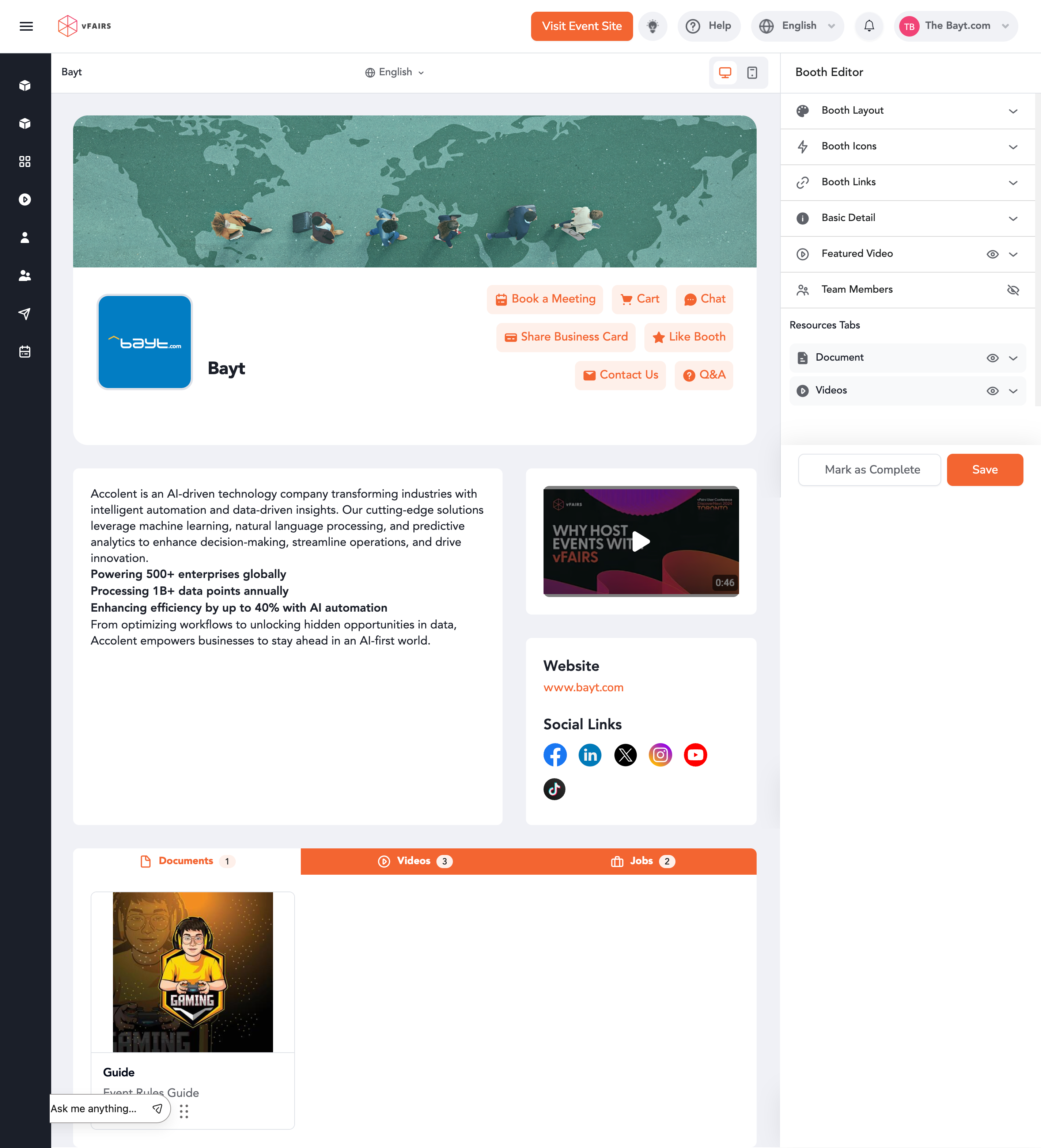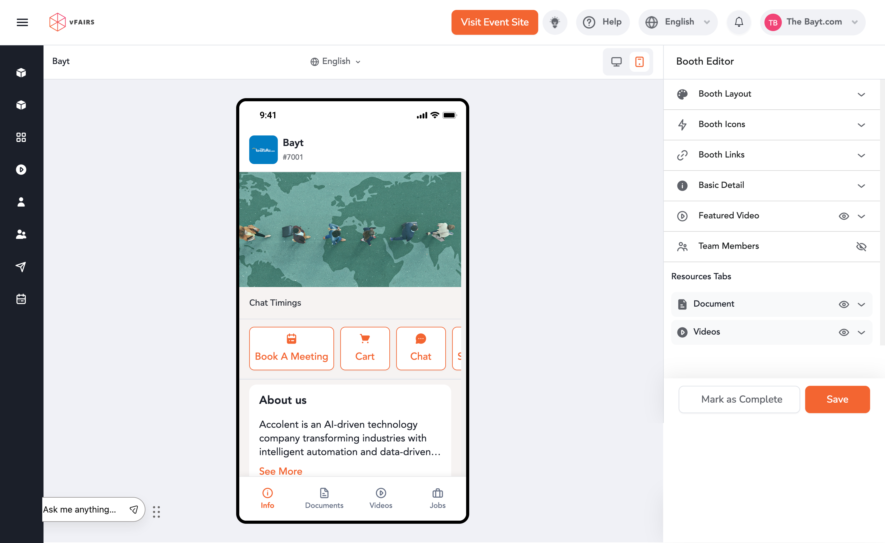 The Live Booth Preview feature allows exhibitors to see how their booth will appear to attendees in real time. You can preview your booth in both web and mobile app views, ensuring your design, content, and layout look correct before the event goes live.