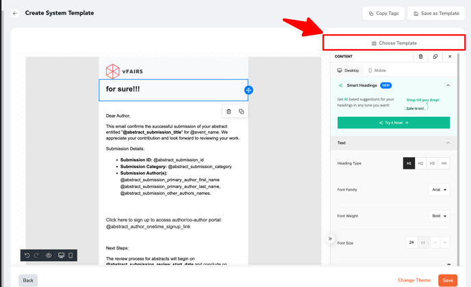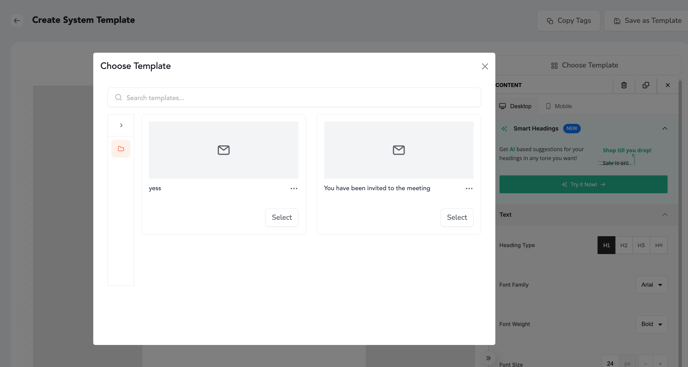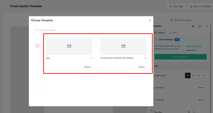 The Templates modal in System Emails is designed for Custom Templates, giving organizers the ability to save, manage, and instantly reuse designs across all system-generated communications.