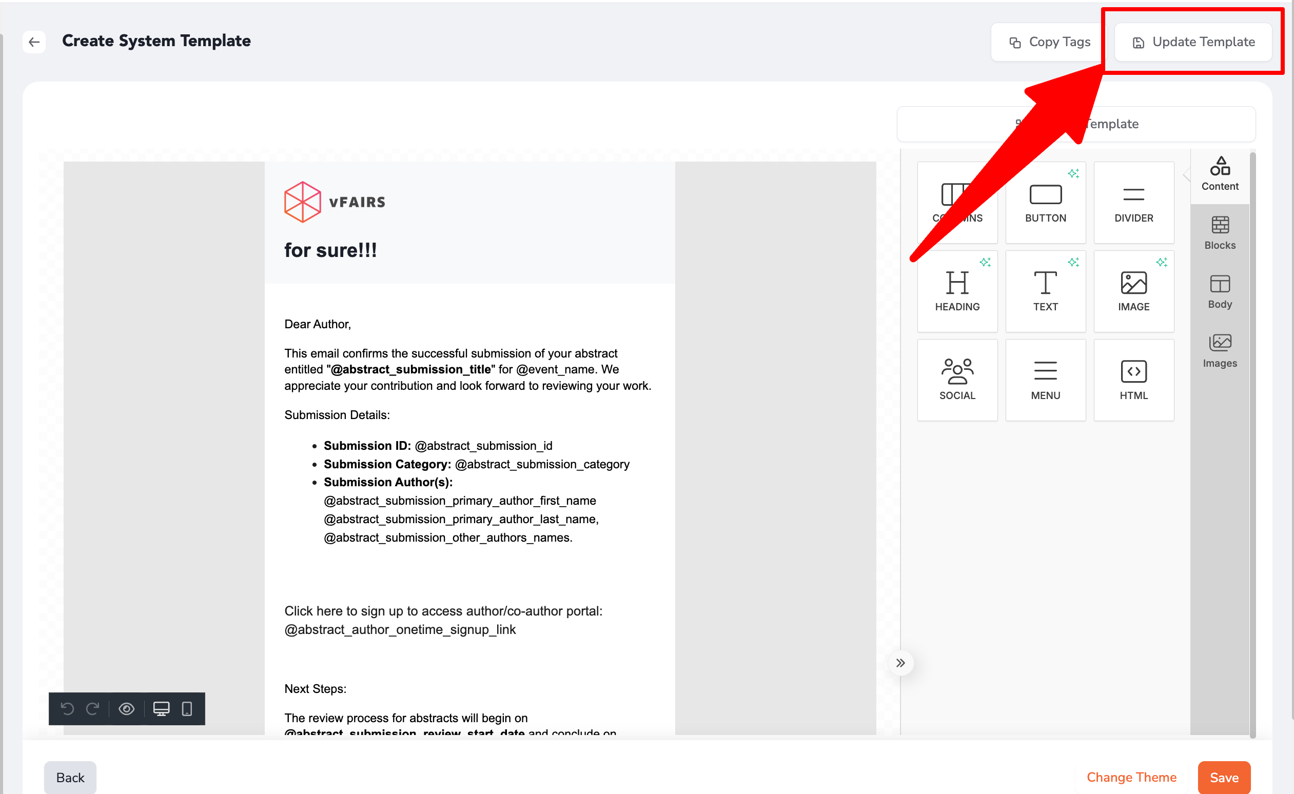 In the System Email builder toolbar, click Quick Save (next to Copy Tags).