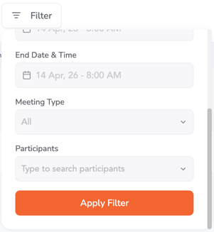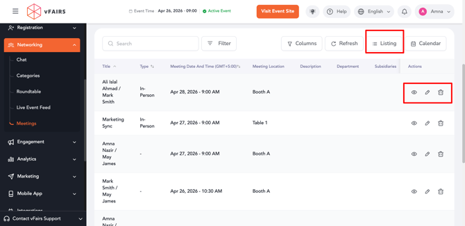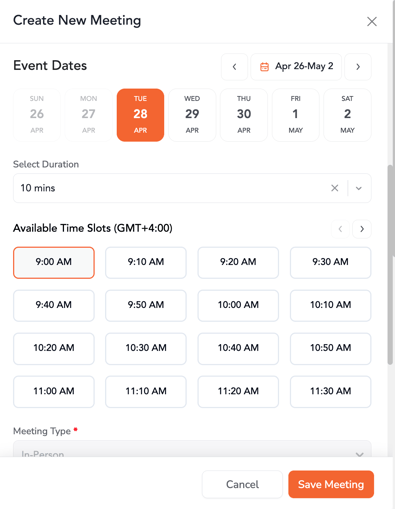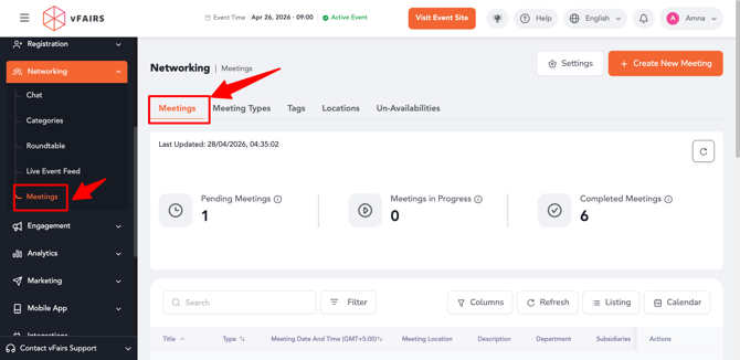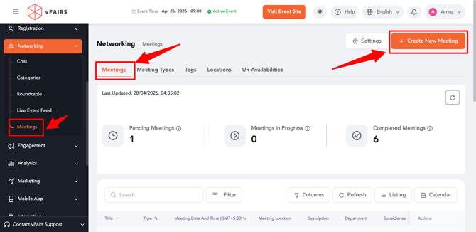 Event organizers and admins can manage all event meetings from a centralized dashboard. This includes viewing meeting statistics, filtering meetings, switching between views, and creating new meetings with advanced configurations.