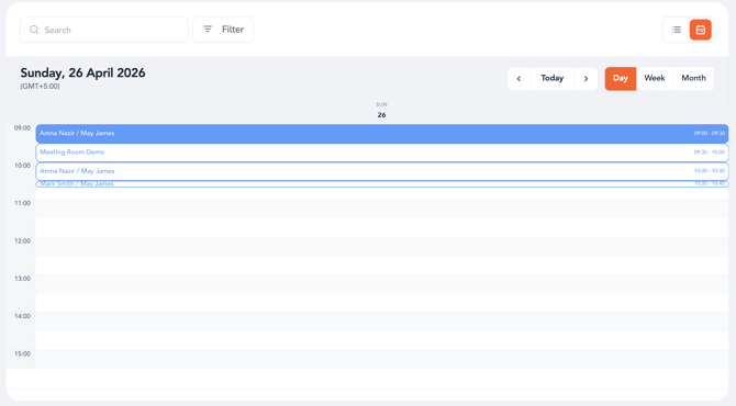 Note: Meetings can be viewed and booked on both web and mobile using similar views, filters, and creation flows.