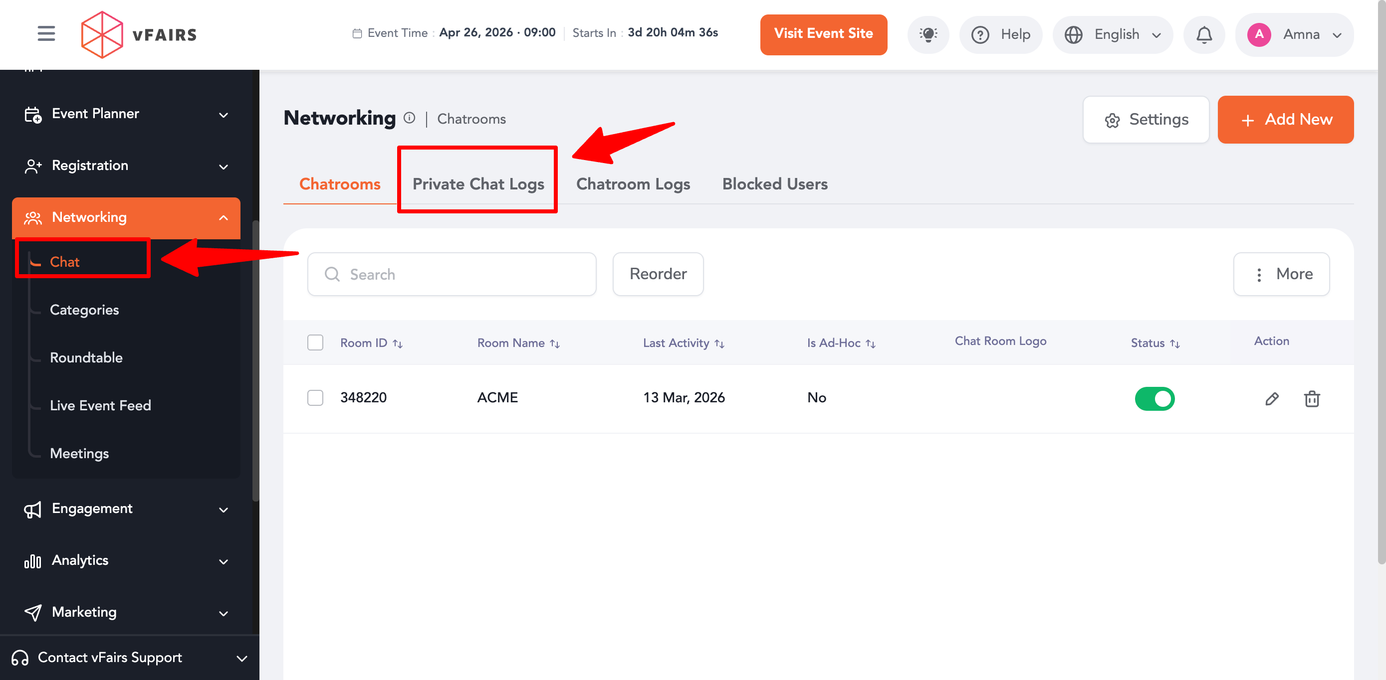 2. Click on Chat > Private Chat Logs to view 1:1 chat logs