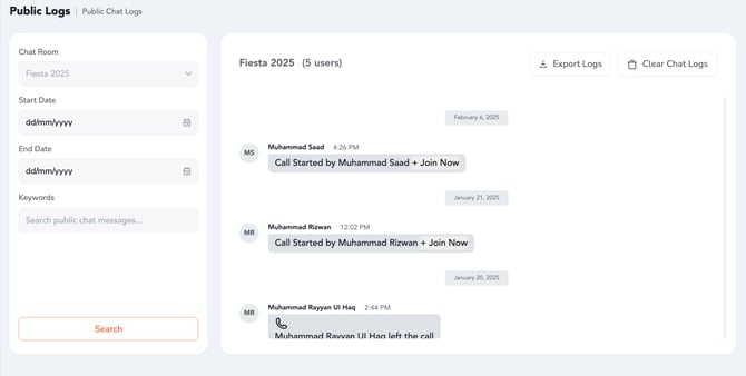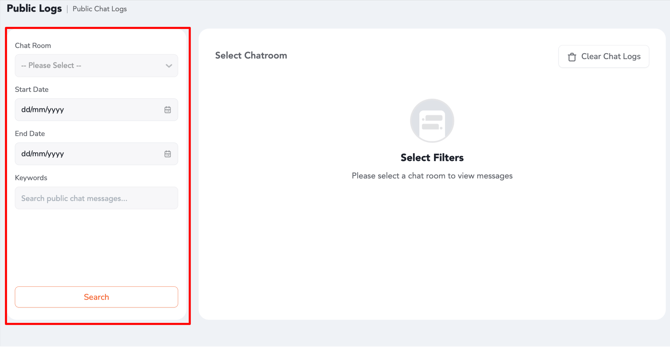 Admins can access both private and group chatroom logs via the Chat Backend. Filtering options such as user names, chatroom selection, duration, and keywords make it easier to locate specific chat interactions.