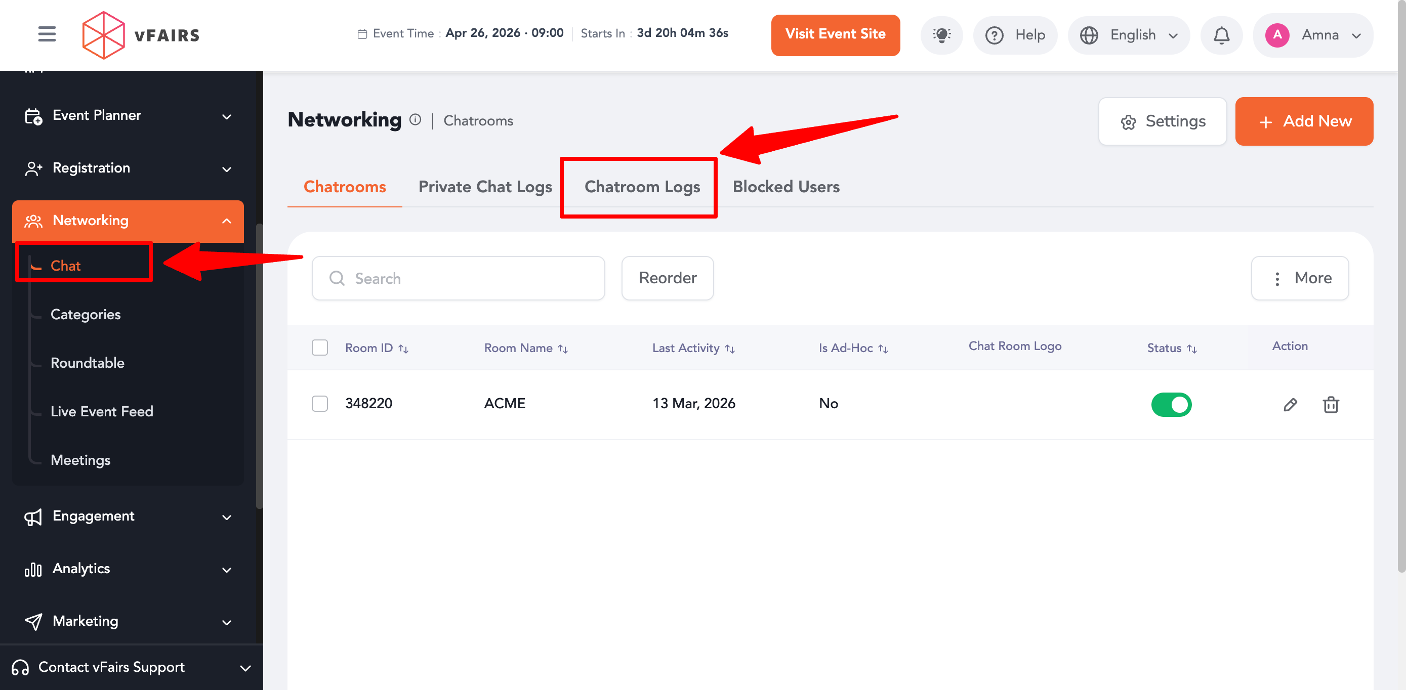 This guide outlines the steps to access and filter chatroom logs for group conversations held during the event.