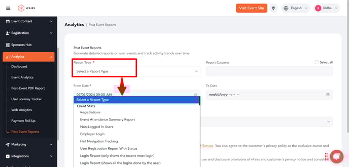 - Select Post Event Reports: Within the Analytics section, find and select 'Post Event Reports.' This area allows you to access different types of reports generated after the event.