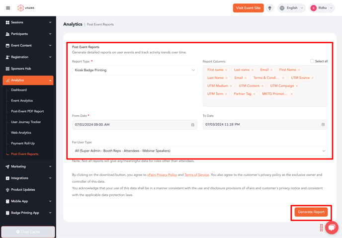 - Kiosk Report: This report provides data on the overall number of badges printed during the event. It helps you track the total output and the number of users who printed the badge.