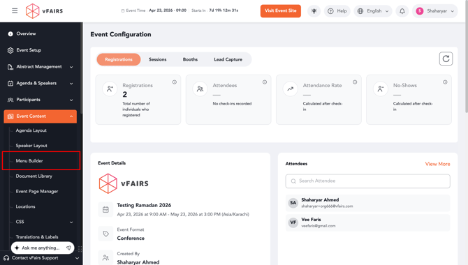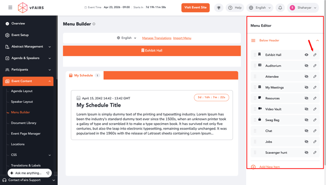 Log in to your vFairs backend and navigate to the Event Content tab on the left-hand sidebar. From the dropdown options, select Menu Builder.