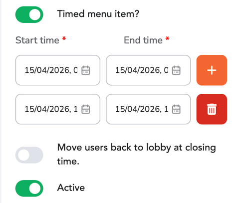 - Add Slots: Click the "+" icon to create multiple start and end time windows. This allows the item to appear and disappear multiple times throughout the event.