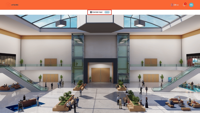 - During the Scheduled Slot: The menu item (e.g., Exhibit Hall) automatically appears in the top navigation bar with a "NEW" tag (if configured), allowing attendees to click and enter.