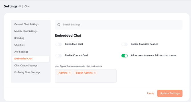 Defines which types of users (Admins, Booth Admins, Attendees) are allowed to create these temporary chat rooms. |