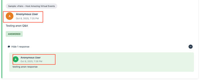 6. If the option to submit and respond to questions anonymously is enabled, those interactions will automatically appear under the name "Anonymous User" on the page.