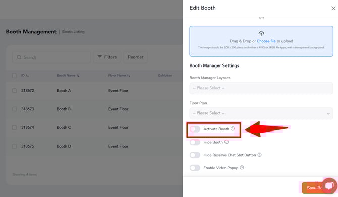 Save Settings: After toggling the activation to ON, ensure to click any 'Save Booth' button present at the end of the edit drawer. This step is crucial as it confirms the changes and officially activates the booth for the event.