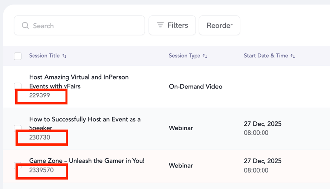 NOTE: These IDs can be found under the Session Title in the Session Listing (See below image):