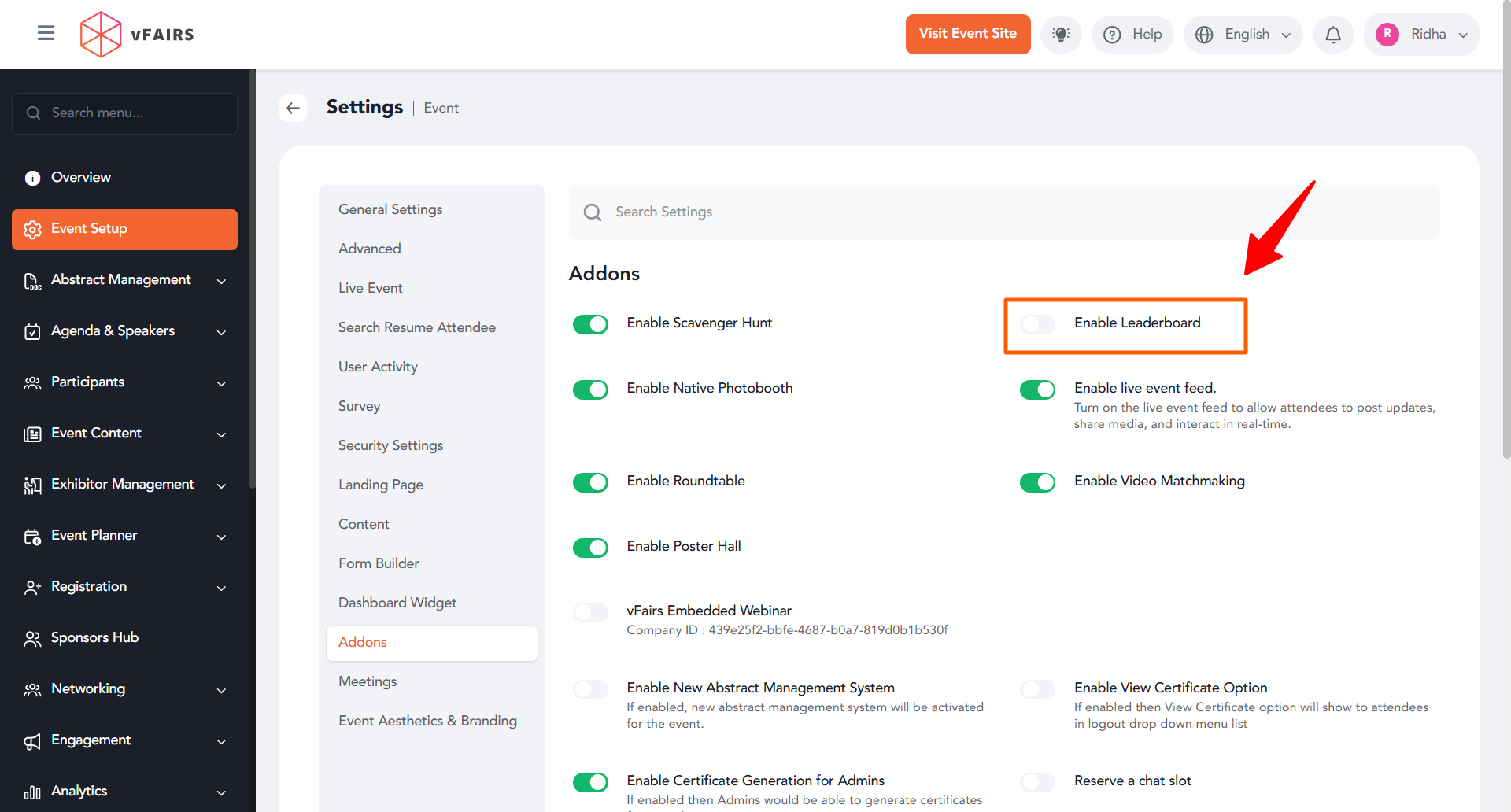In the Event setup section seen on the left navigation menu, click on the “Leaderboard Quiz” button present under Addons Settings to make it visible to attendees. Click 'Update' button present at the end of the page to save the settings.