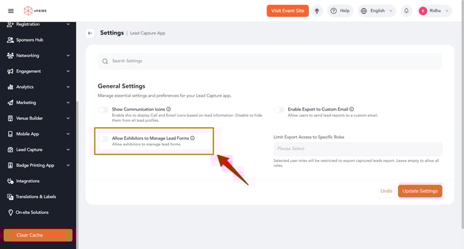 Enable the Allow Exhibitors to Manage Lead Forms toggle