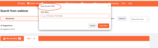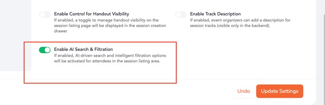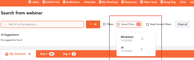 Learn how to enable the AI Search and filter functionality in the sessions listing area of your event platform, including how to apply filters and save your customized AI-powered searches.