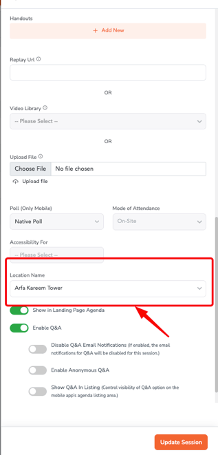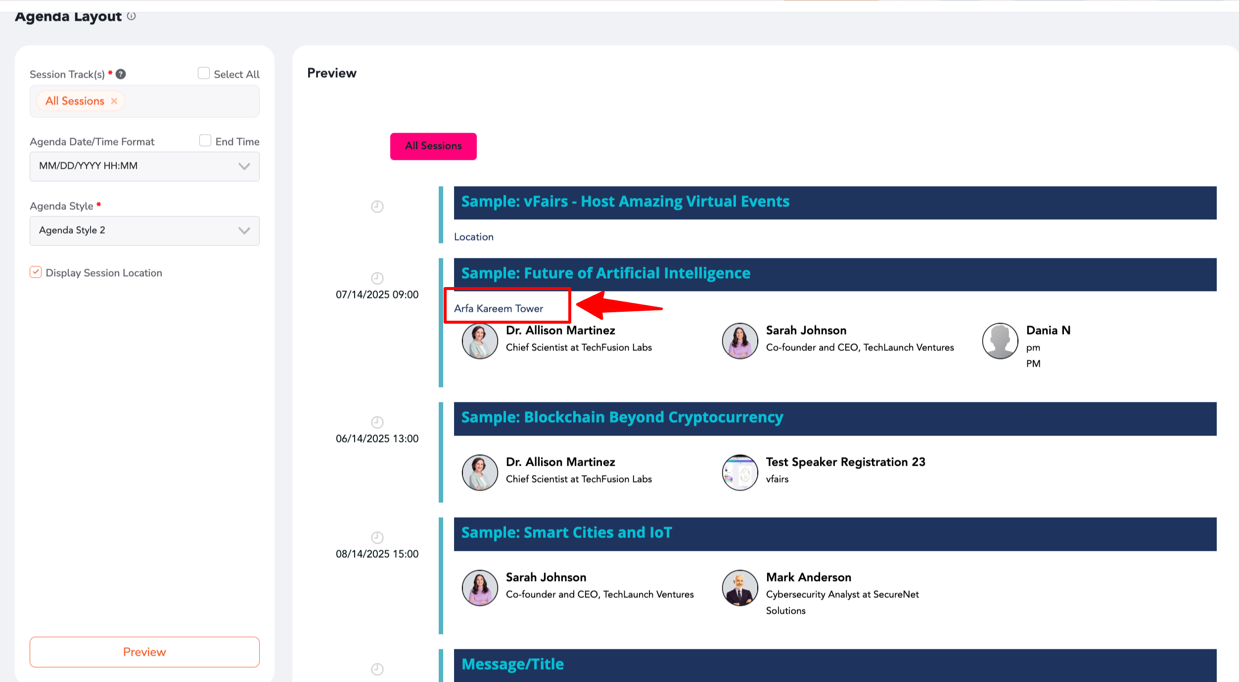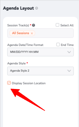 Once these steps are completed, the assigned session locations will appear directly on the agenda, displayed beneath each session title for attendees.
