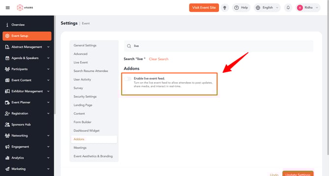 - Toggle on Enable Live Event Feed to activate the Live Feed feature.
