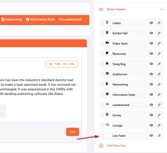 - Expand Below Header Menu. The Live Feed option will appear as the last item in this menu. Position the Live Feed menu item to the desired position by dragging and dropping.