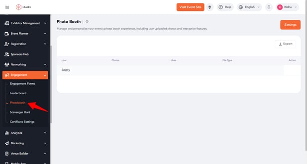 - Once enabled, the Photo Booth option will appear in the left menu under the Engagement section.