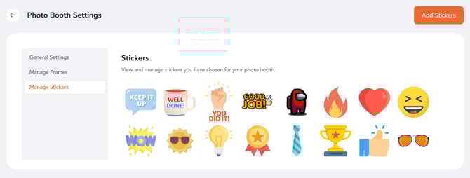 - Manage Stickers: Click Manage Stickers to view or add stickers. Add stickers by selecting Add Stickers and following the upload instructions.
