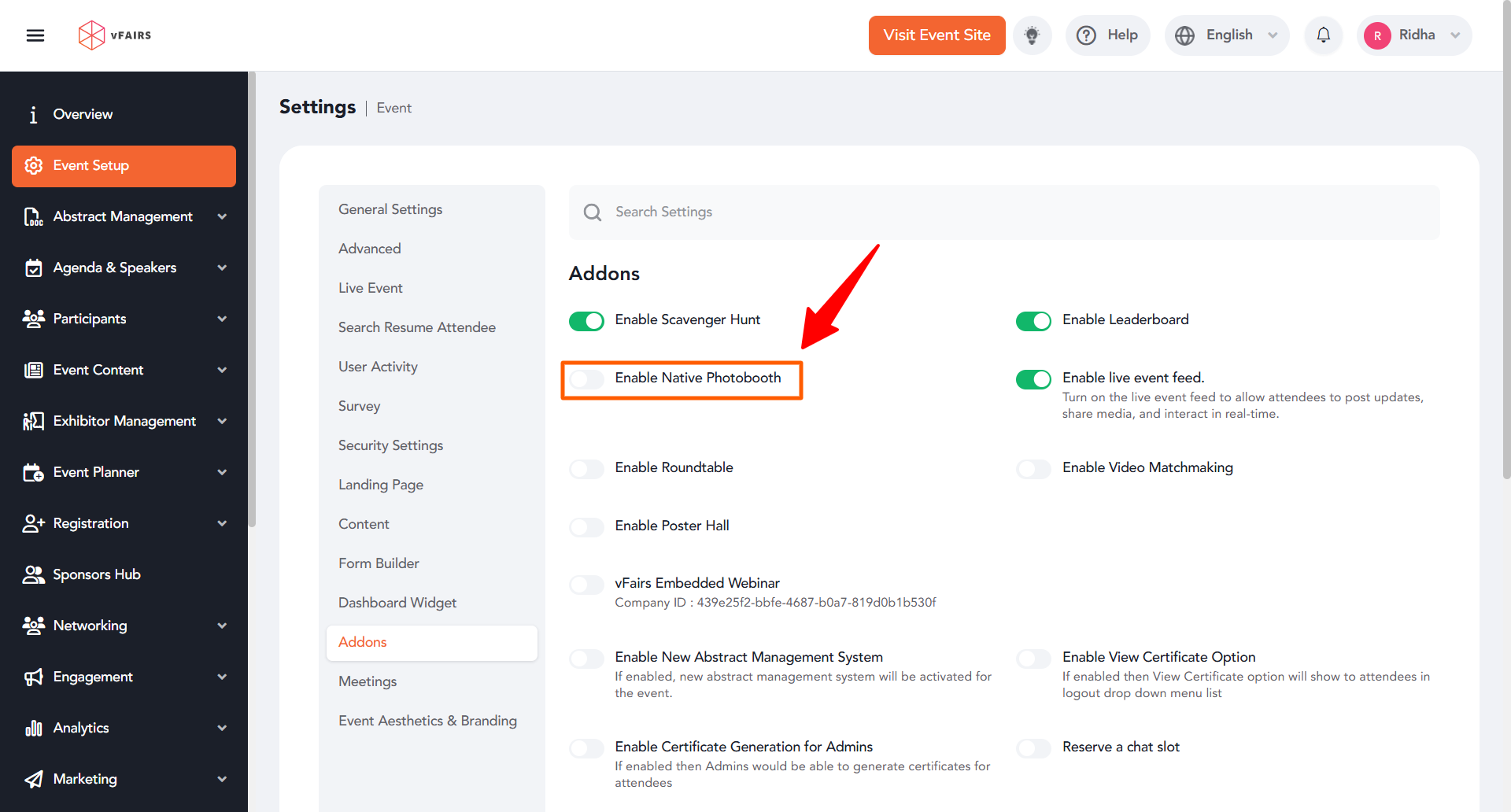 - In the left navigation bar, click Engagement and select Photo Booth.
