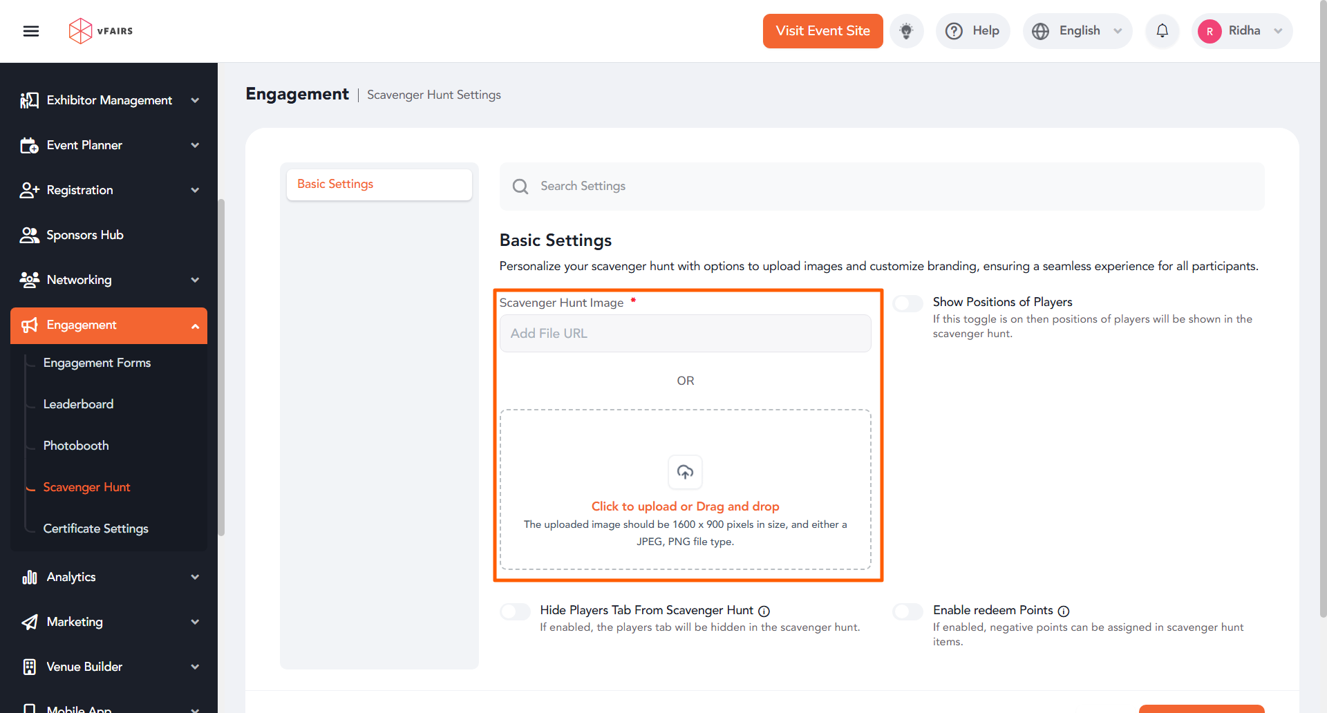 Upload a custom image to match your event branding. This image will be displayed within the Scavenger Hunt interface.