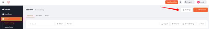 - Head over to the Agenda and Speakers Module and click sessions listing tab. Then click on the "Settings" button.