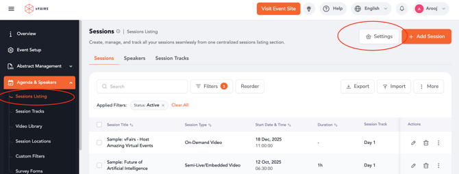 Navigate to the Backend → Sessions Listing area and open the Session Settings.