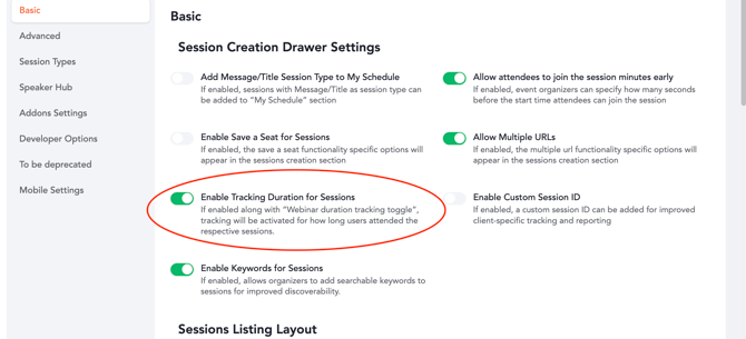 2. Under the Basic Settings section, enable the toggle labeled “Enable Tracking Duration for Sessions.”