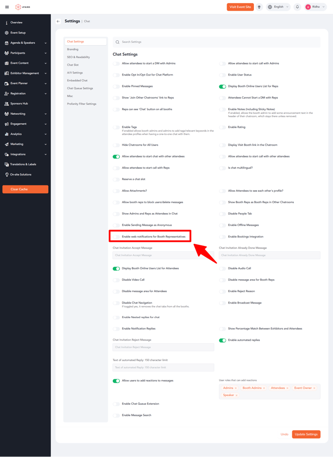 In the Chat Settings page, locate the option labeled “Enable web notifications for Booth Representatives”.
