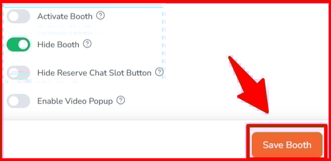 In the Edit drawer, click Advanced settings and scroll to the bottom of the drawer to locate 'Hide Booth' toggle. Enable the toggle to hide the booth.