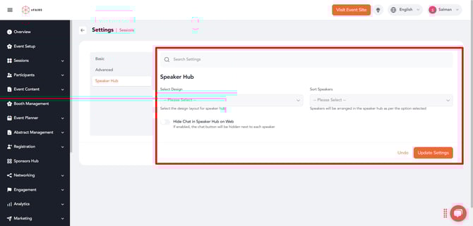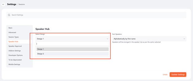 Note: The “Select Design” option in the Speaker Hub allows users to choose between two available design templates. By default, “Design 1” is automatically applied when a new event is created.