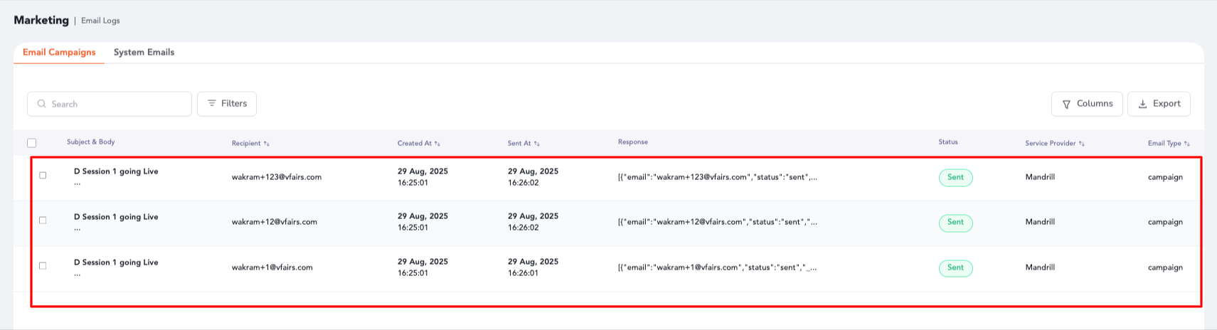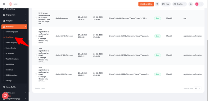 Head over to the Email Logs section in your event’s backend to review all sent email activity and message details.