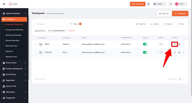 Click the pencil icon (Edit) in front of the booth admin you wish to edit.