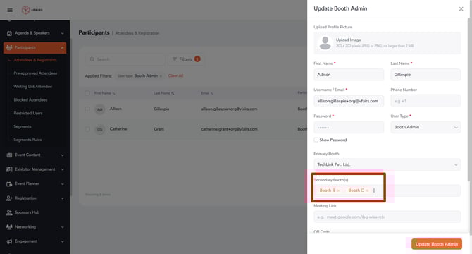 The selected Booth Admin will now be able to manage all the booths assigned to them (primary and secondary) from a single interface.