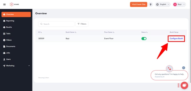 - Enter Booth Configuration: Click on 'Configure Booth' within the Overview section. This action will direct you to the Booth Builder, a tool designed for customizing and setting up your booth’s virtual or physical appearance and features.