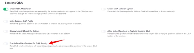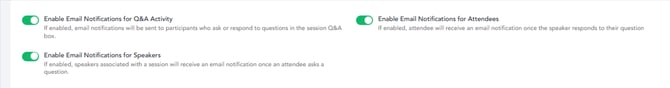 3. Scroll down to the "Sessions Q&A" sub-section and enable the toggle that reads "Enable Email Notifications for Q&A Activity".