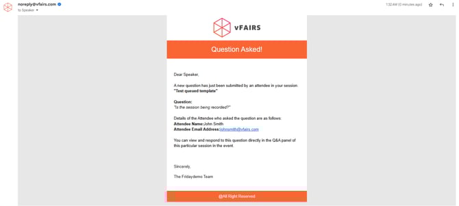 6.Enablement of main toggle and both the sub-toggles will ensure that every time a question is posted in the Q&A box, the speakers associated with that session receive an email notification with the question and attendee details who posted the questions. And same goes for attendees that they'll receive an email when the question is responded by the speaker of that session.