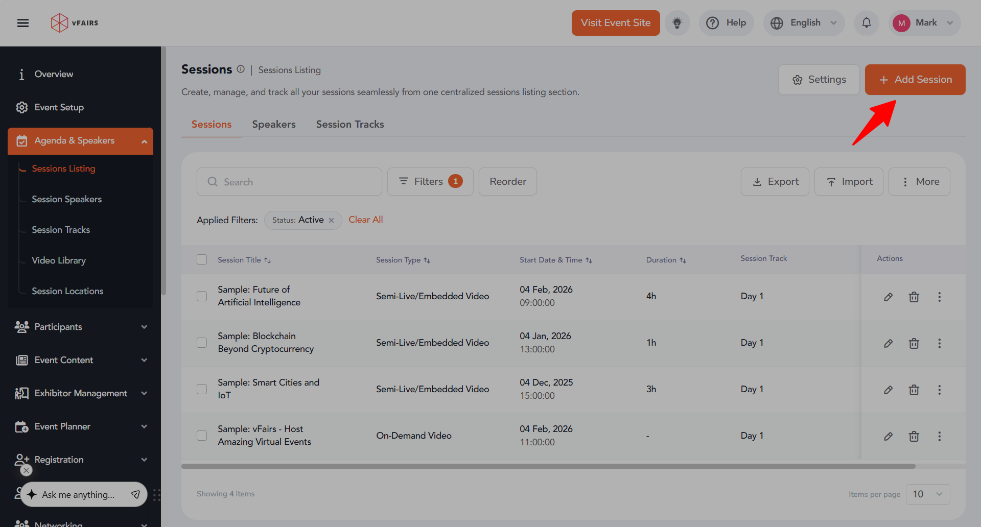 1. Head over to the Sessions listing section under Agenda and Speakers module in the backend and click on the "Add Session" button.
