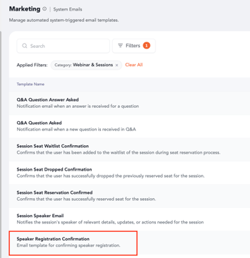 4. The template "Speaker Registration Confirmation" will show up in the the emails listing.