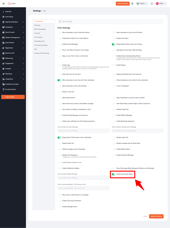 In the Chat Settings page, locate the “Enable Automated Replies” toggle.