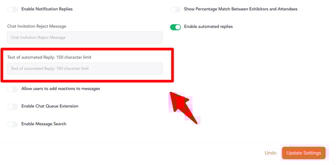 Enter the desired text in the text field for the automated response. This message will be automatically sent to attendees when they initiate a chat if you're not available.