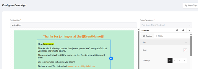 4. A "Email Tags" pop up will appear with the tags that can be copied as per an email's requirement.
