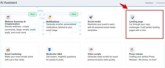 The AI Assistant tool helps generate landing page content efficiently, saving time and ensuring high-quality copy. This guide explains how to use the AI tool to create full landing pages or specific sections.