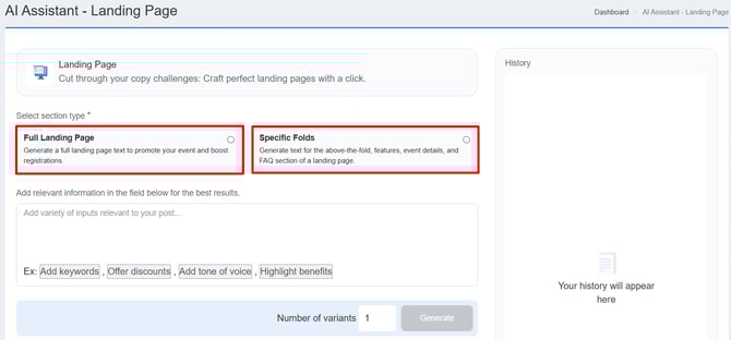 Specific Folds – Allows you to generate content for individual sections of the landing page. Select the fold type: